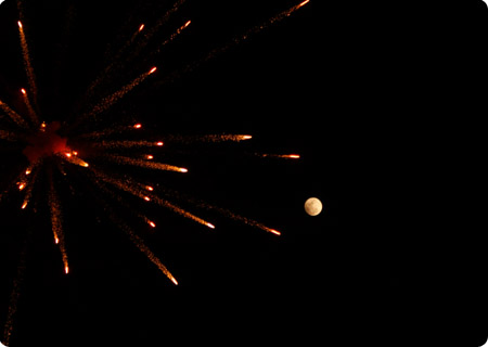 晚上,吃了汤圆,看到了52年的元宵中最大的月亮,隔壁家在屋顶上放烟花,映着烟花的月亮[:话泣奉:],很美丽.